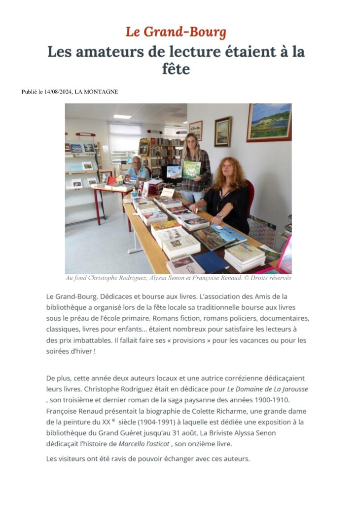 PRESSE | les livres à la fête de Grand-Bourg | journal La Montagne, 14 août 2024 Auteur/autrice de la publication :françoise Publication publiée :14 août 2024 Post category:presse Commentaires de la publication :0 commentaire Un article de Bernard Ladillier, correspond local du journal La Montagne, autour de la fête du 3 août et on l’en remercie… Laisser un commentaire Annuler la réponseCommentEnter your name or username to comment Enter your email address to comment Saisir l’URL de votre site (facultatif) Δ Ce site utilise Akismet pour réduire les indésirables. En savoir plus sur la façon dont les données de vos commentaires sont traitées. Étiquettes: fête de village, Le Grand-Bourg, livres Read more articles Article précédentPRESSE | Un doux moment entre écriture et peinture | 28 juin 2024 à Grand-Bourg (23) Article suivantJournal LA MONTAGNE | Merci à Sarah Q. pour son article du 4 août 2025 sur ma présence au salon de Mortroux Vous devriez également aimer PRESSE | Un doux moment entre écriture et peinture | 28 juin 2024 à Grand-Bourg (23) 15 juillet 2024 BTN a lu ‘Bois d’Azobé’ | l’Art…vues, 14 mars 2022 14 mars 2022 l’Art…vues | un article de BTN sur mon dernier récit « ce lieu où tu aurais prévu de te rendre n’a pas de nom » | numéro d’août-septembre 2023 8 août 2023