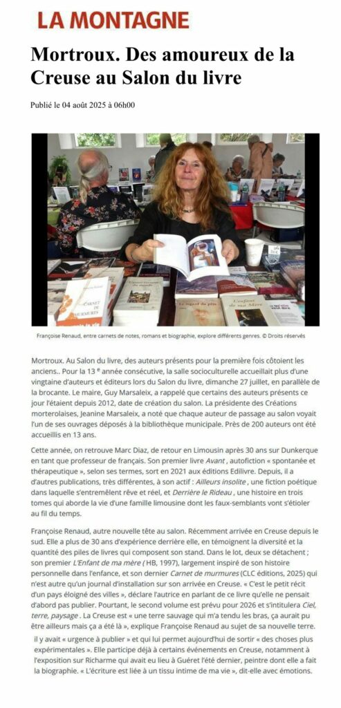 Journal LA MONTAGNE | Merci à Sarah Q. pour son article du 4 août 2025 sur ma présence au salon de Mortroux Auteur/autrice de la publication :françoise Publication publiée :5 août 2025 Post category:actualité / presse Commentaires de la publication :0 commentaire en ligne ici sur le site de La Montagne Laisser un commentaire Annuler la réponseCommentEnter your name or username to comment Enter your email address to comment Saisir l’URL de votre site (facultatif) Δ Ce site utilise Akismet pour réduire les indésirables. En savoir plus sur la façon dont les données de vos commentaires sont traitées. Read more articles Article précédentUn samedi à Meilhards en Corrèze | 21 juillet 2025 Article suivantCARNET DE MURMURES à la fête de CHAMBORAND (23) | photos et presse, 3 août 2025 Vous devriez également aimer QUATRE SAISONS | montage photographique | une promenade poétique aux Fougères, octobre 2025 19 octobre 2025 Cadences & Variations, écrire lire partager, 12 & 13 juin 2021 16 juin 2021 EYJEAUX, « petit salon du livre » en Haute Vienne | 17 novembre 2024 18 novembre 2024