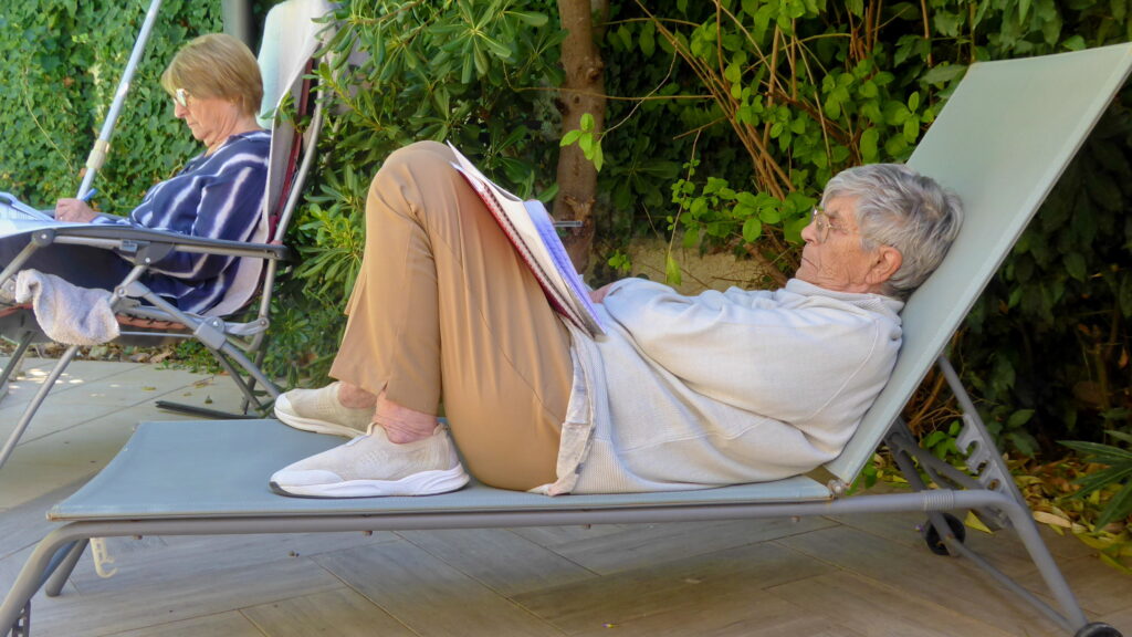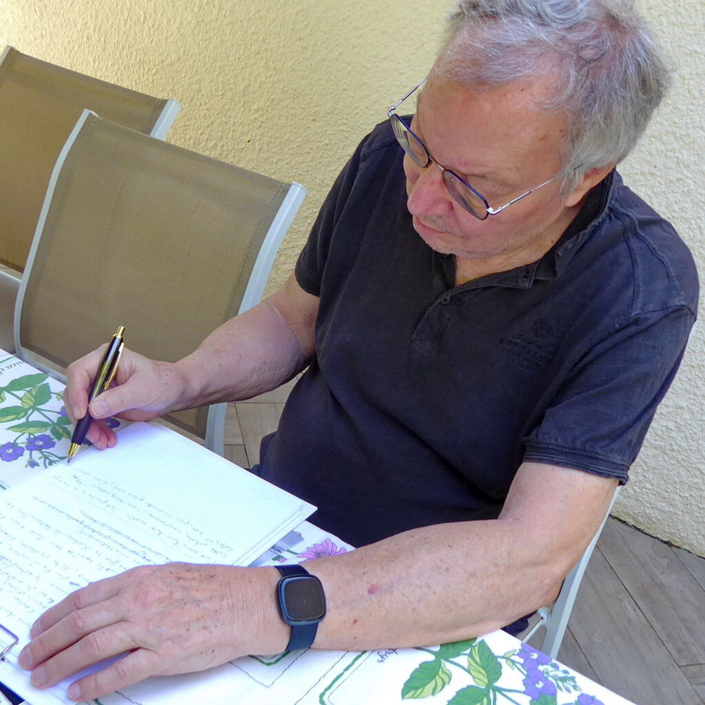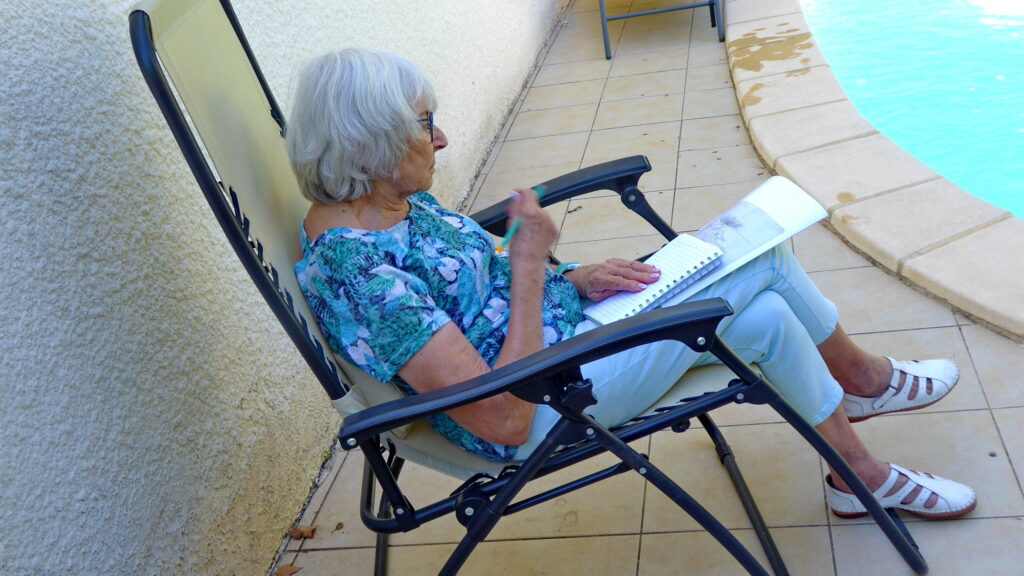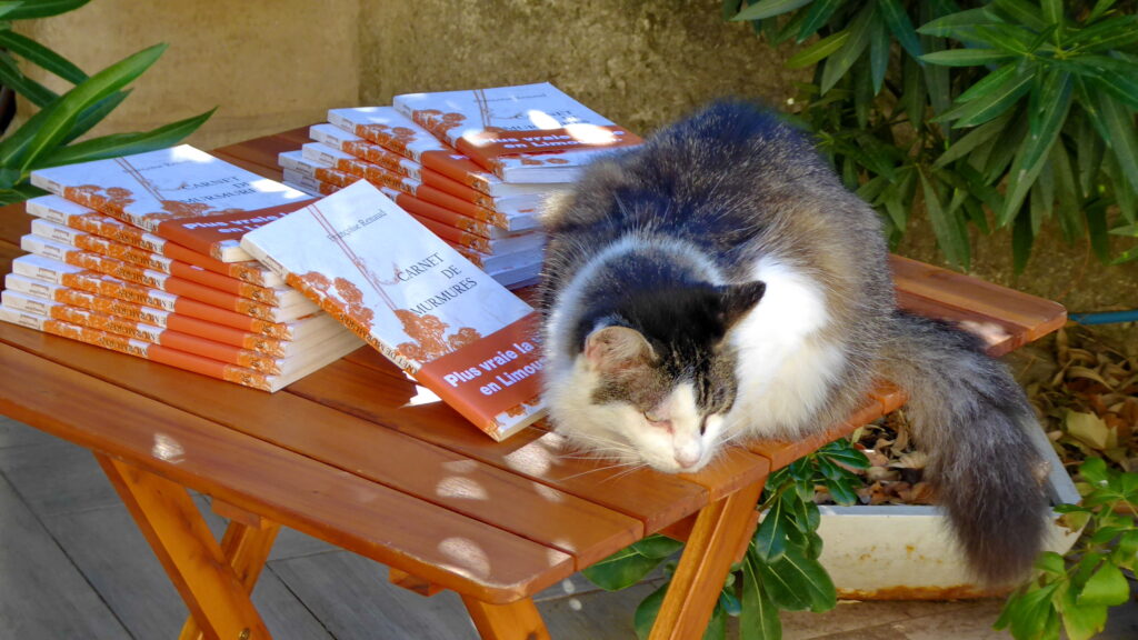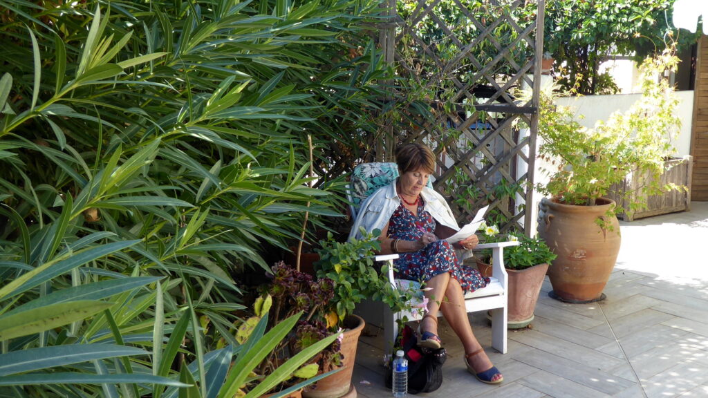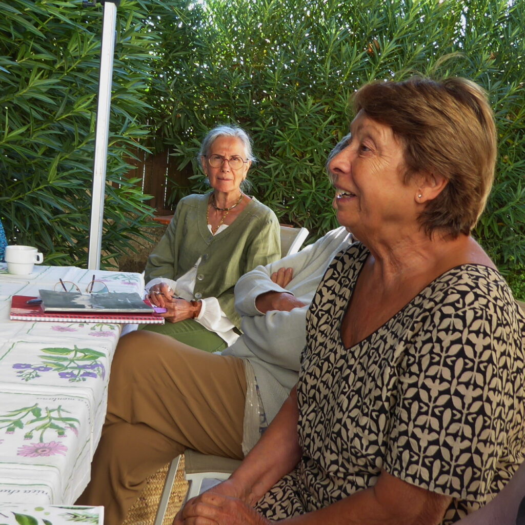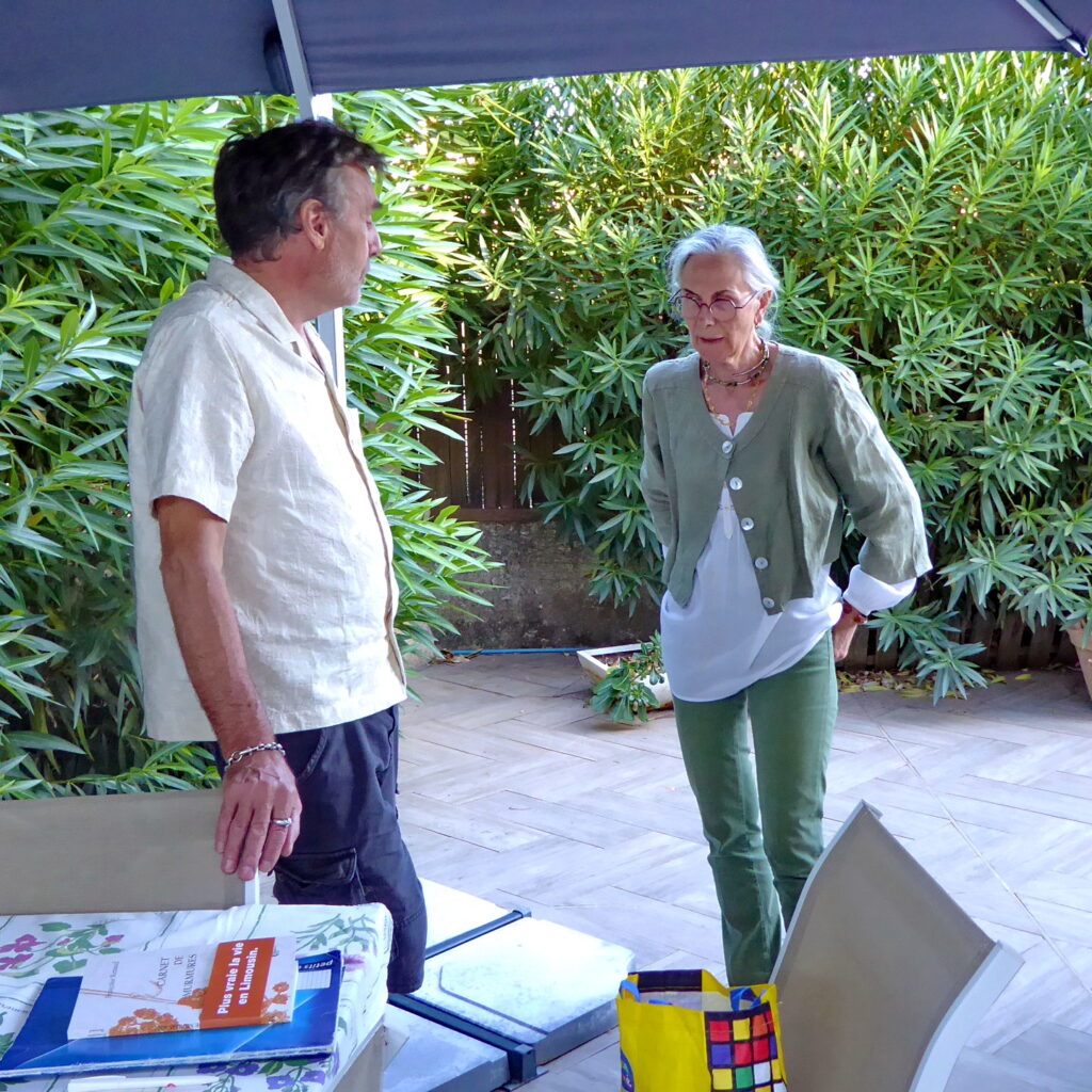 Et comme à chaque fois, nous nous retrouvons dans un jardin. En ce mois de septembre, c’est celui de Lydia à Lavérune, amie de longue date, qui a toujours fréquenté et aimé l’atelier. Elle nous accueille avec beaucoup de joie et sa chatte, si délicate, semble nous trouver fréquentables. Le ciel est clément, on a de la chance…