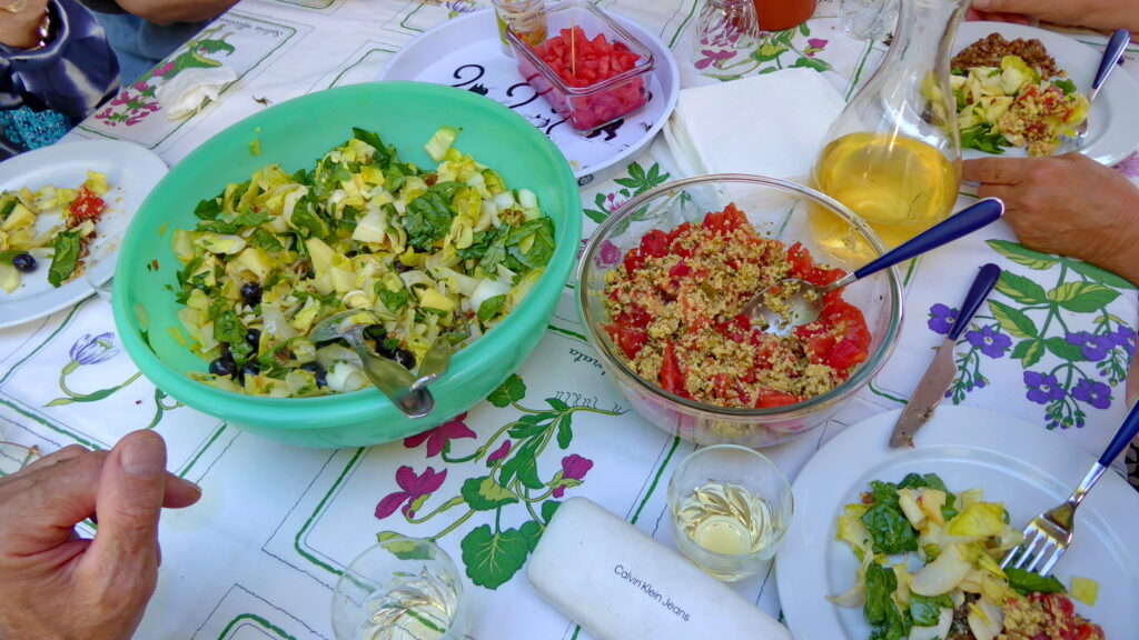 Mais non, on n’a pas fait que dormir ! On a écrit, réfléchi, lu du Tarkos et du Claudie Hunzinger, parlé de grands cerfs et de sangliers, partagé des salades, du pain et du vin. Aussi des petits fromages des Cévennes apportés par Martine (c’est devenu une tradition !). On a parlé de nos peines et de nos réjouissances. En écriture on a fait ce qu’on pouvait, avec les forces du jour et le désir remuant à l’intérieur.