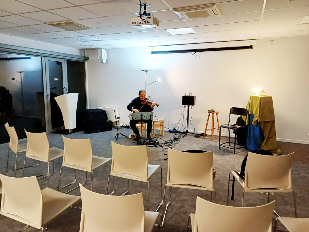Il faut préciser qu’il pleuvait fort depuis plusieurs jours, voire plusieurs semaines sur la région montpelliéraine. Le samedi encore, il tombait des cordes. L’heure approchait. Les réglages sonores étaient délicats à cause de la moquette et du plafond bas.